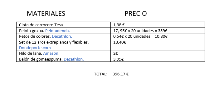 Os dejamos una tabla con los materiales necesarios y sus correspondientes precios para realizar la sesión planteada. A estos gastos de material habría que añadirle el precio de alquiler de frontón que normalmente suele ser de 10-15€/h.
